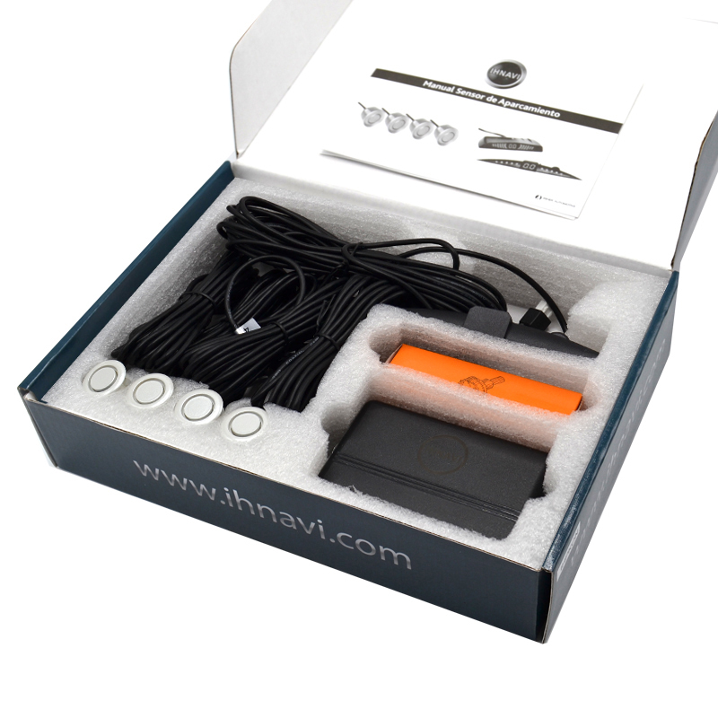 Sistema de sensores de aparcamiento trasero con 4 sensores de taladro (tipo tapón) con zumbador de aviso acústico tipo buzzer. Color Blanco.