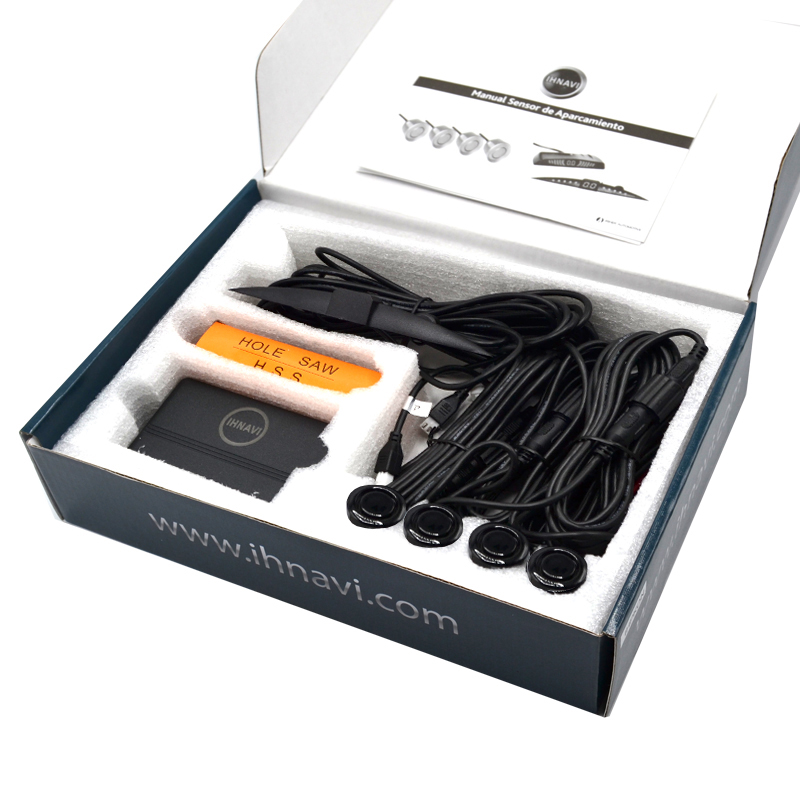 Sistema de sensores de aparcamiento trasero con 4 sensores de taladro (tipo tapón) con zumbador de aviso acústico tipo buzzer. Color Negro.