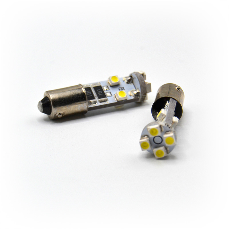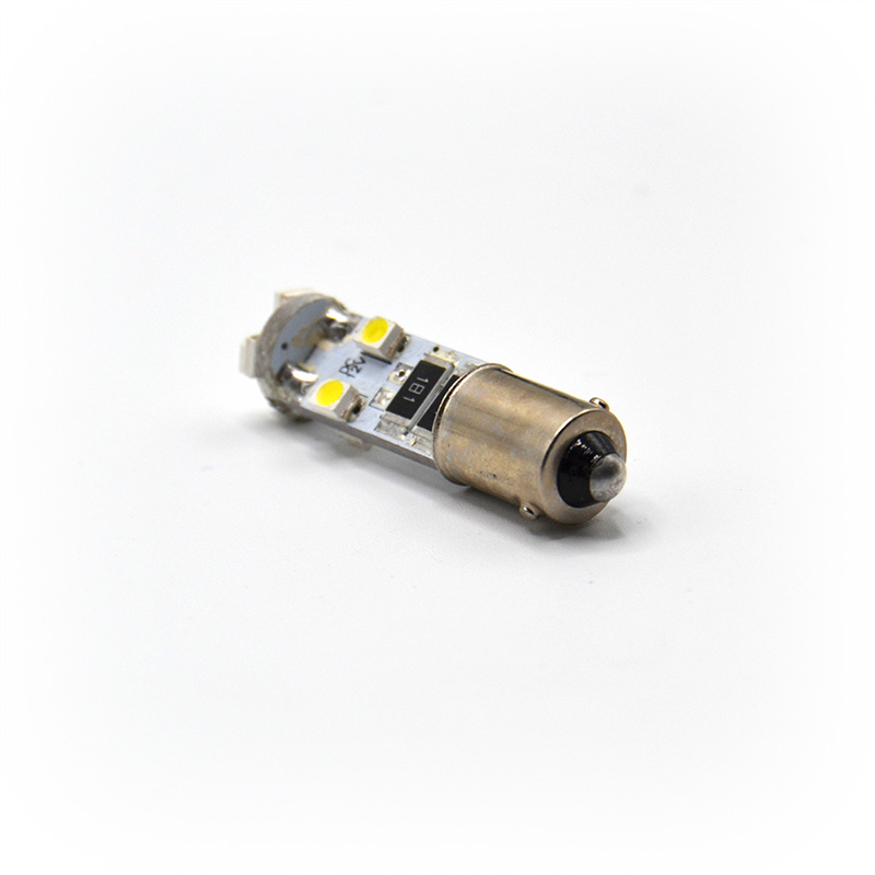 Bombilla LED de tipo BA9S con casquillo de polos alineados con 8 leds SMD de chip 1210 en orientación 360 (cuatro frontal y cuatro laterales).