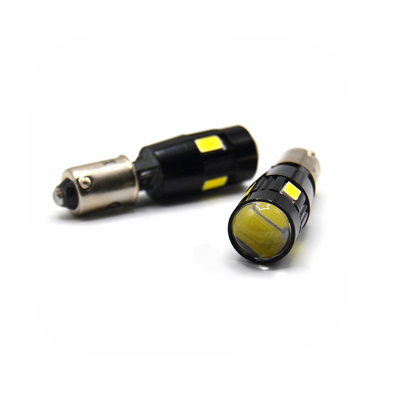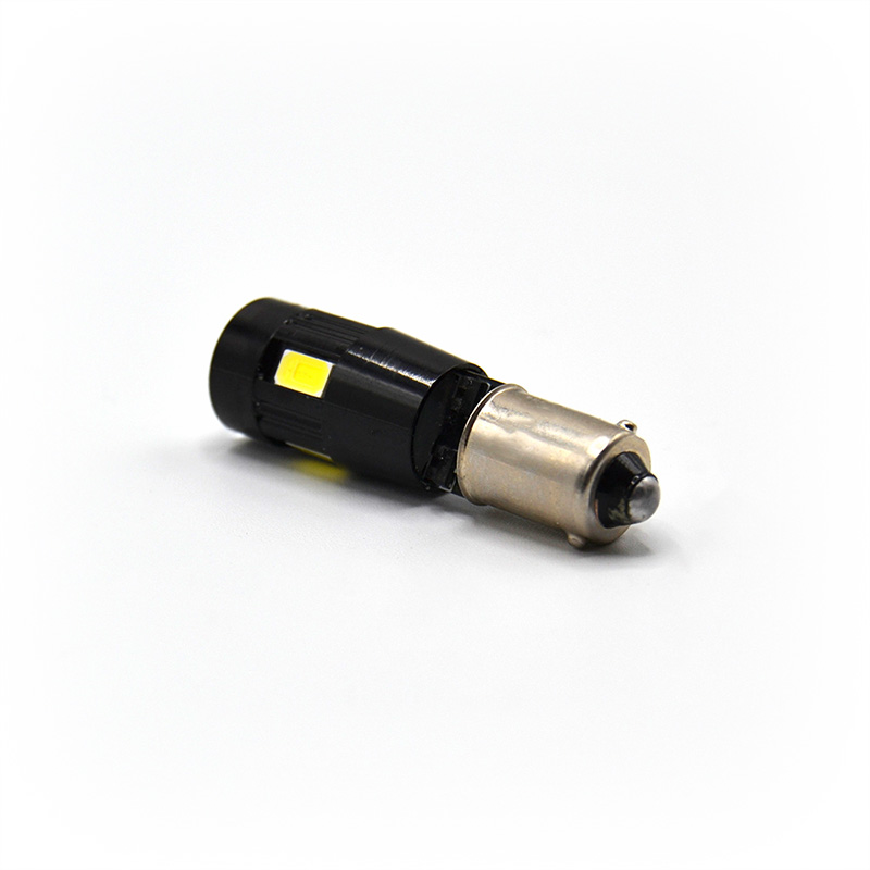 Bombilla LED de tipo BA9S con casquillo de polos alineados con 6 leds SMD de chip 5630 en orientación 360 (uno frontal y cinco laterales).