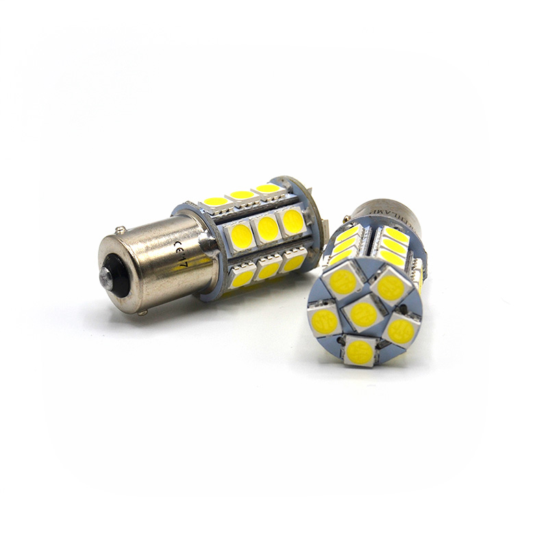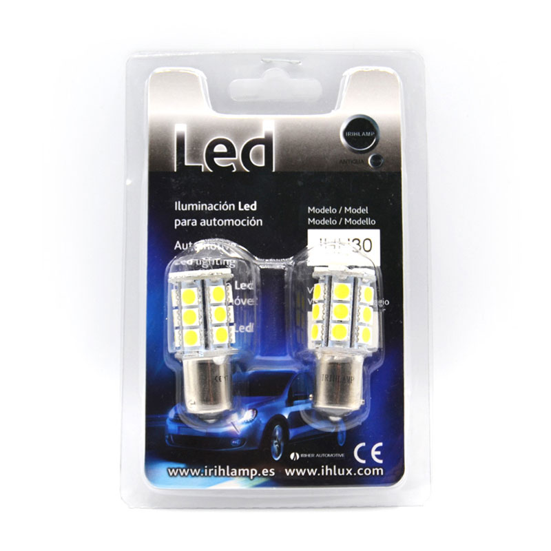 Bombilla LED de tipo P21W un polo con casquillo de tetones alineados con 24 leds SMD de chip 5050 en orientación 360 (seis frontales y dieciocho laterales).