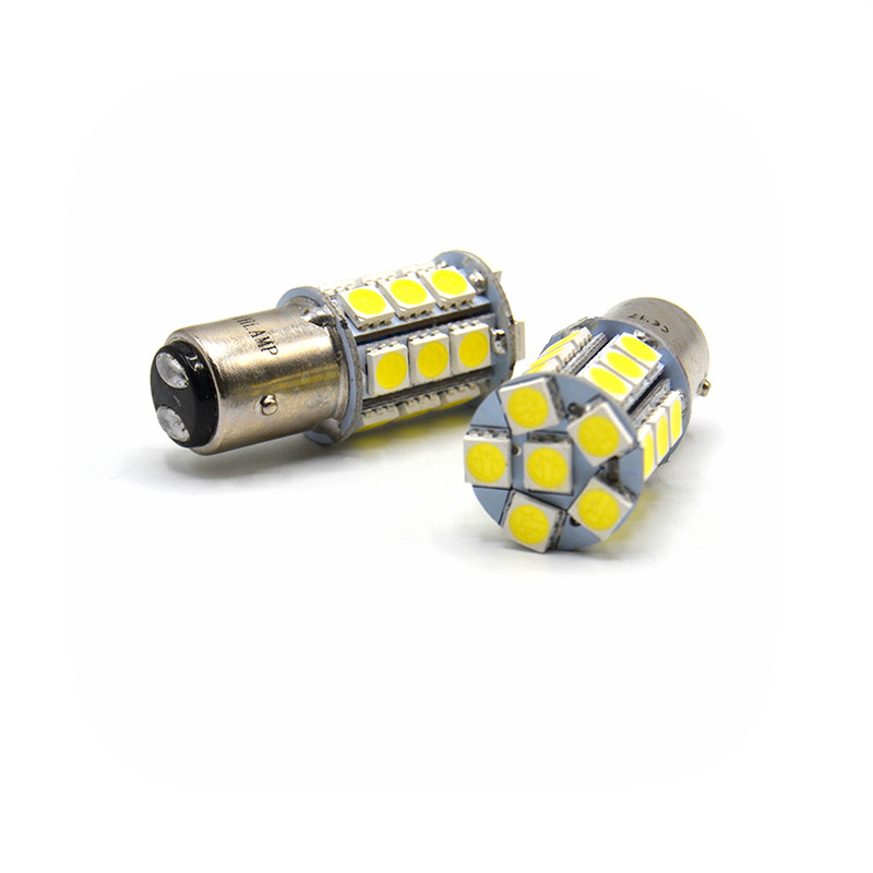 Bombilla LED de tipo P21W dos polos con casquillo de tetones alineados con 24 leds SMD de chip 5050 en orientación 360 (seis frontales y dieciocho laterales).