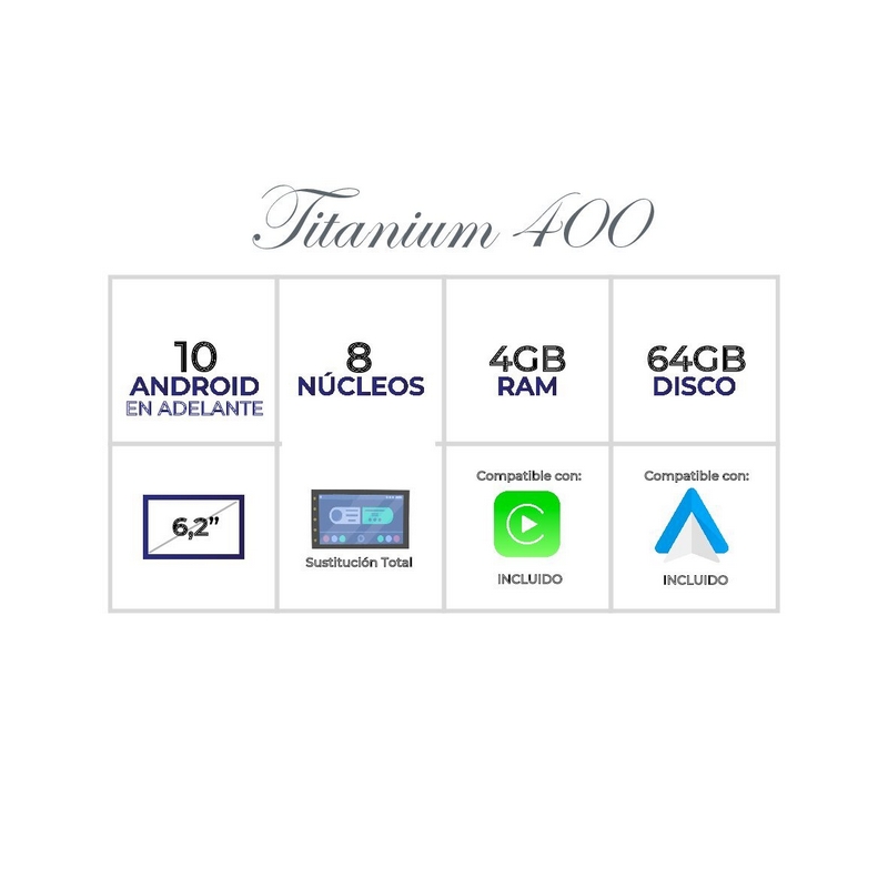 Plataforma Titanium 500: Android 12, 8 Core con 4 GB de RAM y 64 GB de ROM / Disco Duro. Incluido Carplay y Android Auto. Primer fabricante con Hardware de primeras marcas.