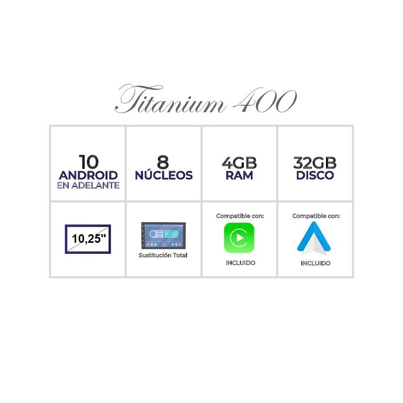 Plataforma Titanium 500: Android (Consultar versión), 8 Core con 4 GB de RAM y 64 GB de ROM / Disco Duro. Incluido Carplay y Android Auto. Primer fabricante con Hardware de primeras marcas.