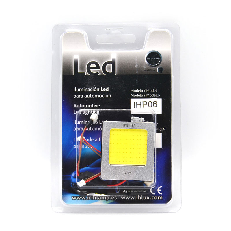 Panel placa de led tecnología COB de medidas 42x37mm. Suministrada con cable multiconexión de tipo W5W T10, C5W festoon y BA9S. Alimentación a 12V. Conexión directa. Con adhesivo en su base.