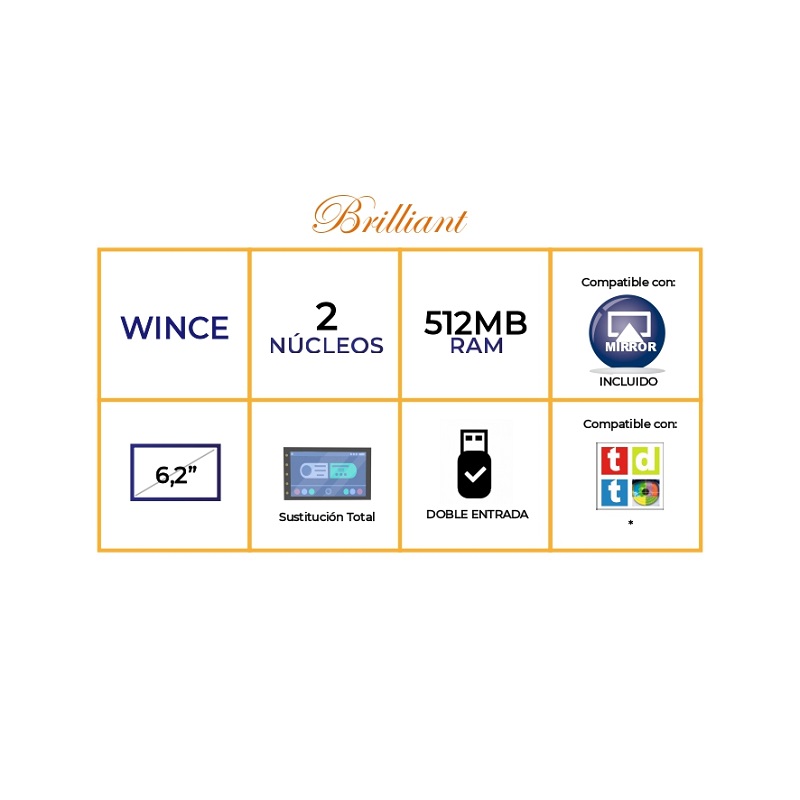 Plataforma Brilliant 100: Sistema WINCE 6.0 con Dual Core y 512MB de RAM. GPS, Mirror Link, 2xUSB y mucho más. Plataforma muy ágil y estable.