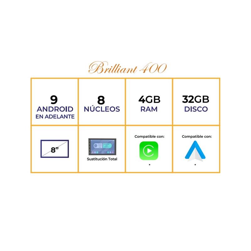 Plataforma Brilliant 400: Android (Consultar versión), 8 Core con 4 GB de RAM y 64 GB de ROM / Disco Duro, con conectividad Carplay y Android Auto.