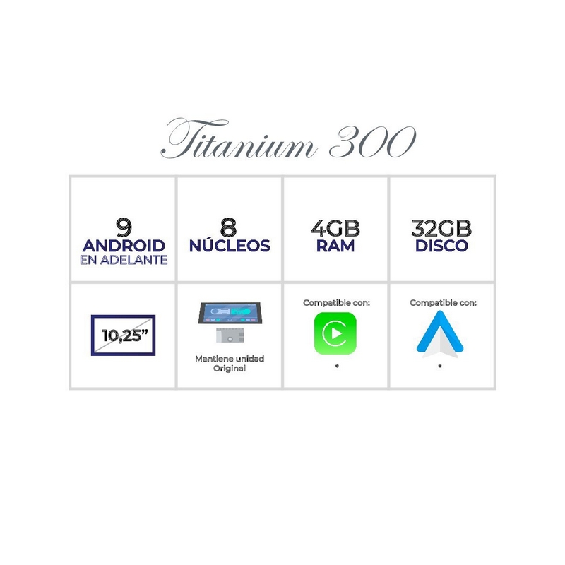 Plataforma Titanium 600: Android (Consultar versión), 8 Core con 8 GB de RAM y 128 GB de ROM / Disco Duro. Primer fabricante con Hardware de primeras marcas. Carplay / Android Auto inalámbrico incluidos en hardware interno.